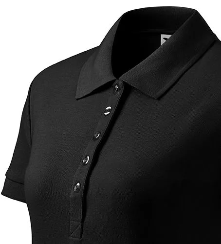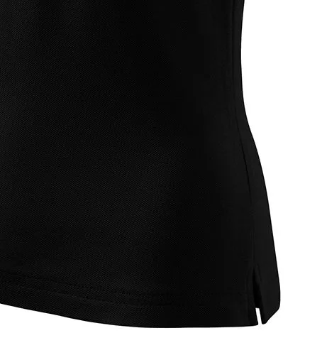 Karcsúsított szabású, kiváló minőségű fekete galléros női póló magas grammsúlyú pamut-piké anyagból, bevágással az oldalvarrásokon!