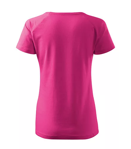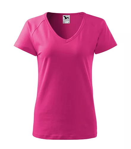 Karcsúsított szabású, csípőig érő, kiváló minőségű rózsaszín női póló single jersey anyagból raglán ujjakkal és V-alakú nyakkivágással