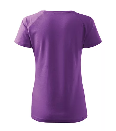 Karcsúsított szabású, csípőig érő, kiváló minőségű lila női póló single jersey anyagból raglán ujjakkal és V-alakú nyakkivágással
