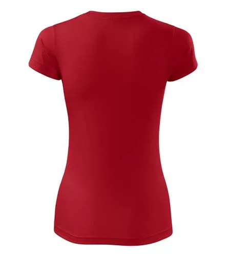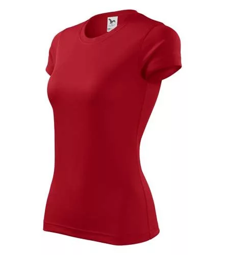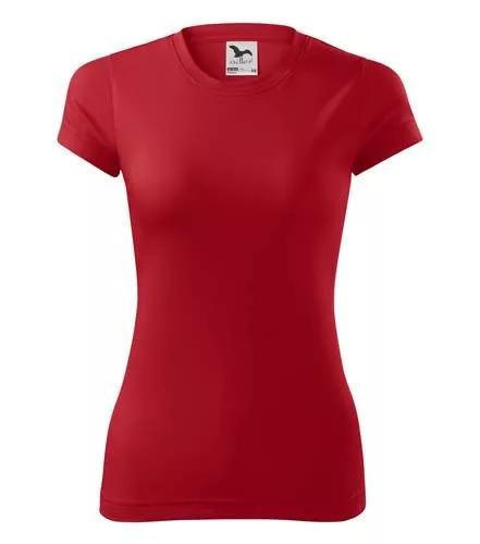 Karcsúsított szabású, kiváló minőségű, szublimációra alkalmas, piros rövid ujjú technikai női póló, poliészter anyagból, divatos, keskeny peremű környakkivágással és nyakmegerősítéssel!