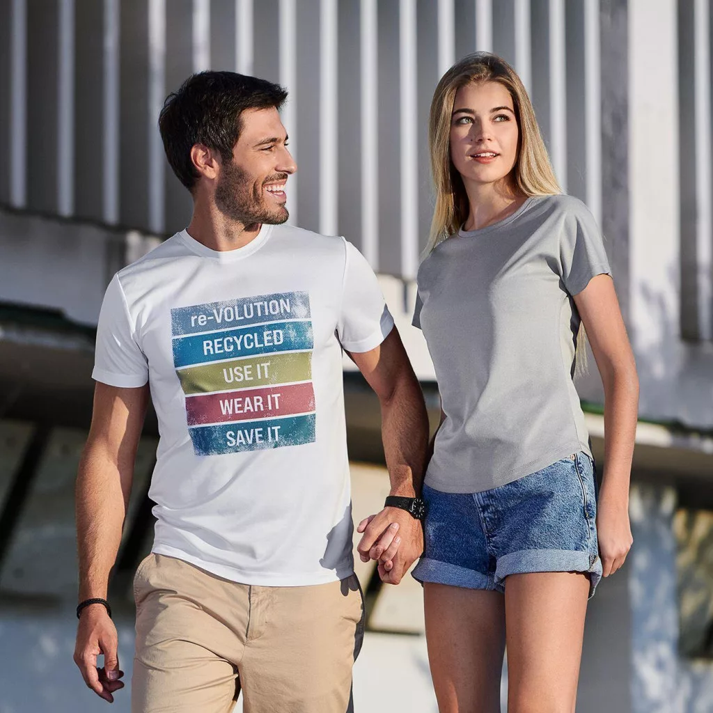 A szürke női póló anyaga 100%-ban újrahasznosított mikropoliészterből (Certified by Intertek 149203-GRS) készült, 140 g/m2 súlyú.
