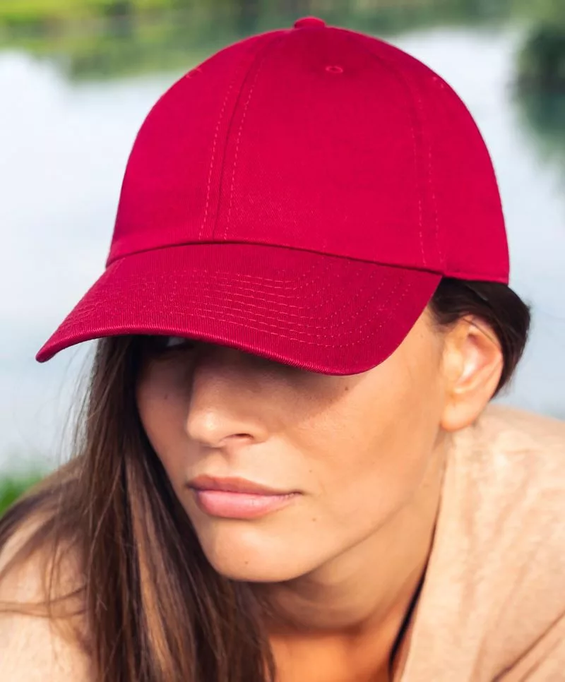 A piros baseball sapka anyaga 100% organikus pamutból készült, 270g/m².
