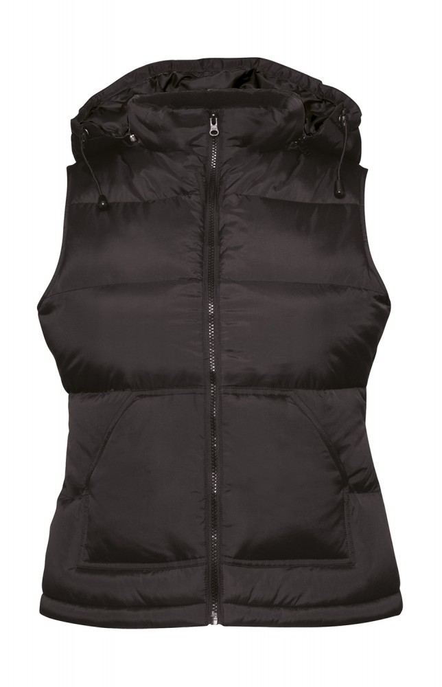 Karcsúsított szabású, kiváló minőségű fekete női mellény lecipzározható, szabályozható kapucnival és nyitott oldalzsebekkel.