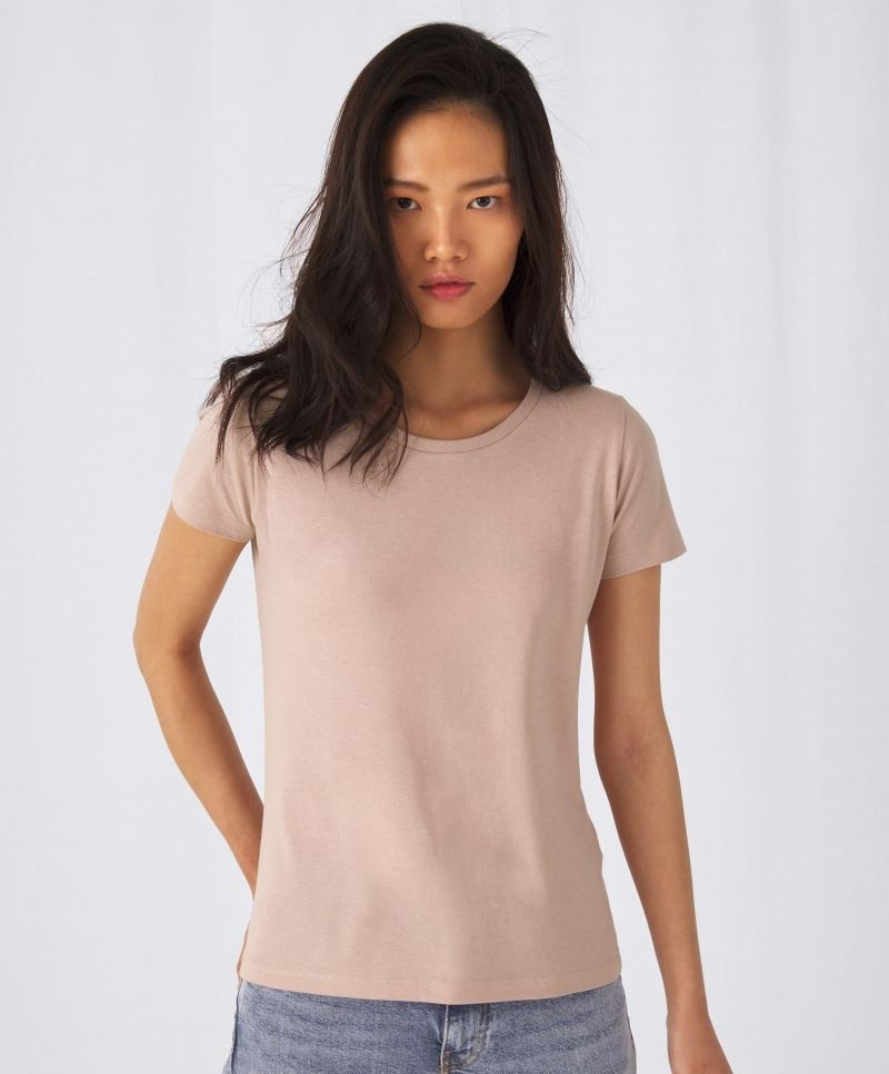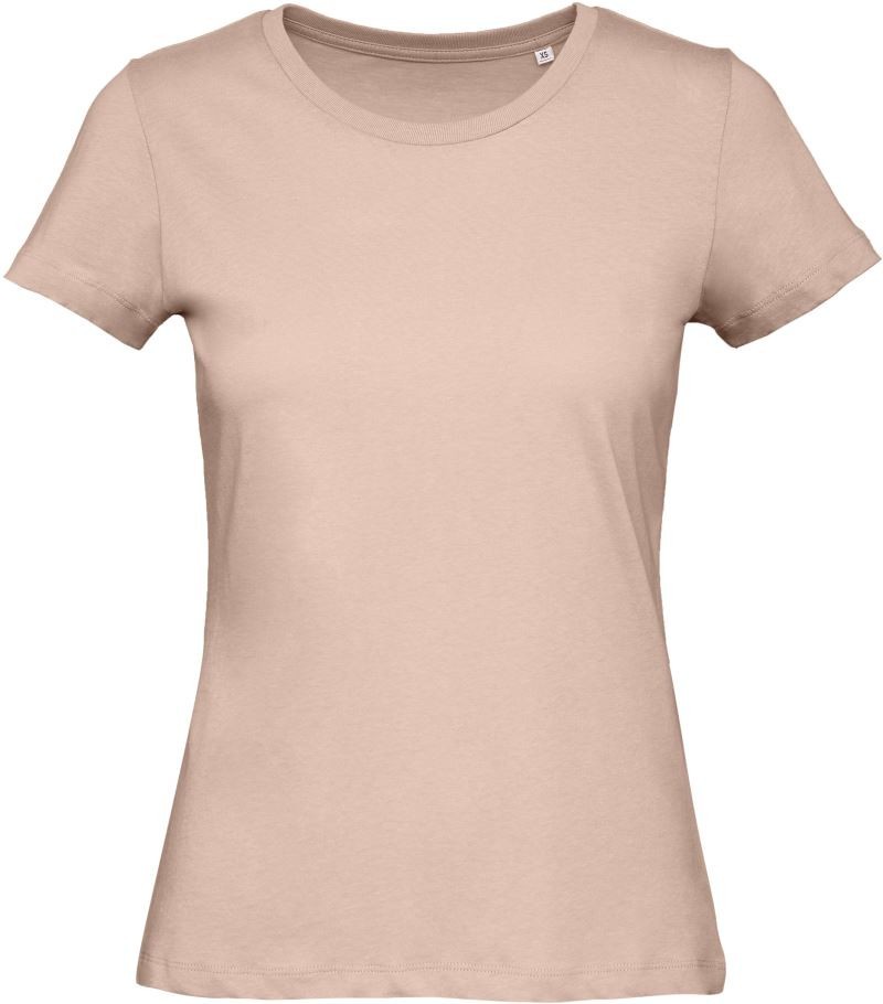 A pink női póló anyaga 100% pamutból (organikus, fésült és gyűrűsfonású) készült, 140 g/m2 súlyú.