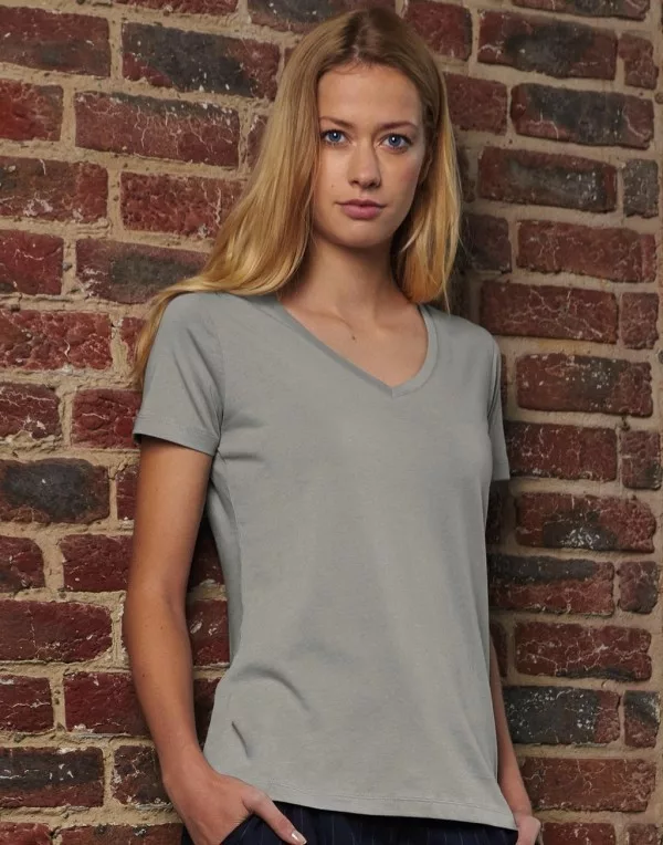 A szürke női póló keskeny, rib kötéses v-nyakkivágással készült. A váll és nyakrész szalagos megerősítést kapott, hogy a póló tartósabb és ellenállóbb legyen.