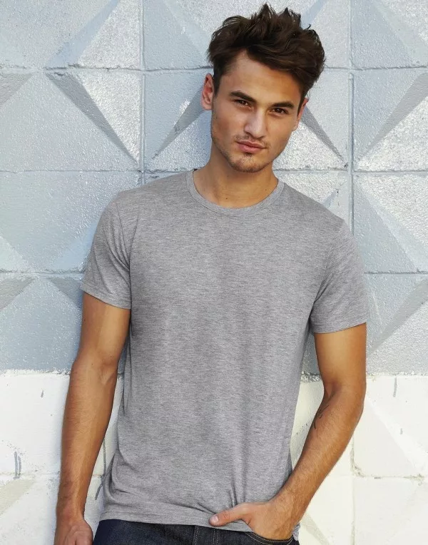 A szürke póló anyaga 50% poliészterből, 25% pamutból és 25% viszkózból készült, 130 g/m2 súlyú. Selymes és puha "Triblend" single jersey anyagból készült.