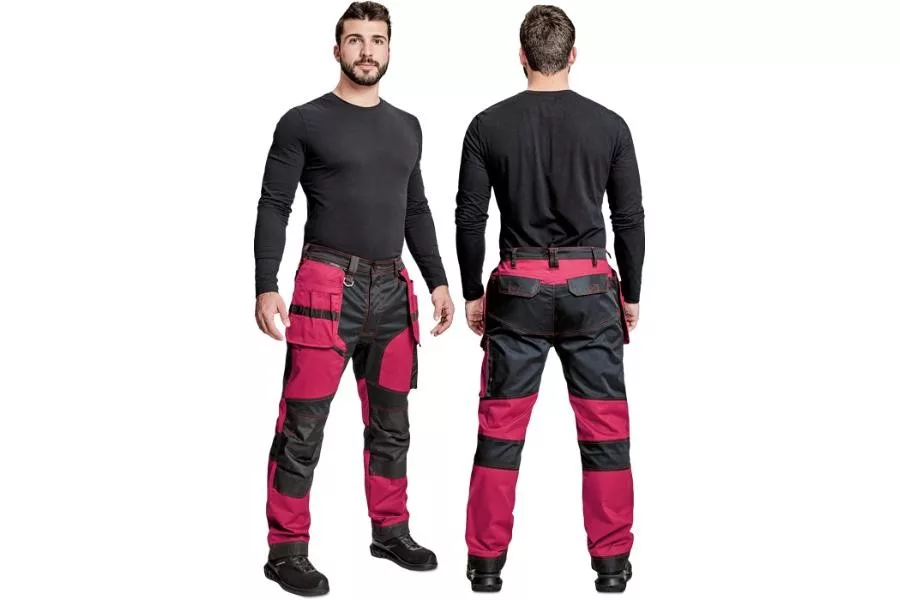 A piros derekas munkásnadrágot megerősített térd- és hátsó résszel, térdvédőtartóval, 5 cm-rel meghosszabbítható nadrágszárral és dekoratív varratokkal készítették.