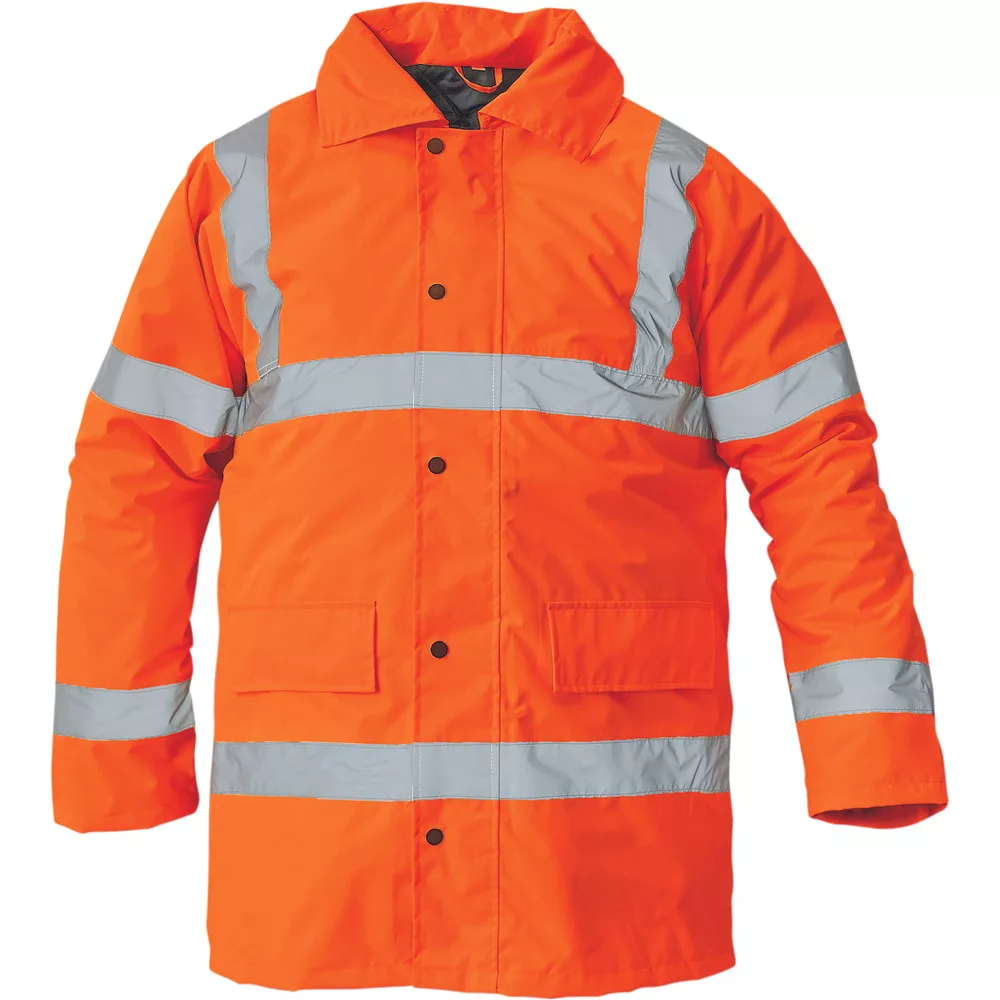 A narancssárga téli kabáton elhelyezetok fényvisszaverő csíkok sötétben jól láthatóvá teszik a viselőjét (EN 471: 3,2 szabvány)!