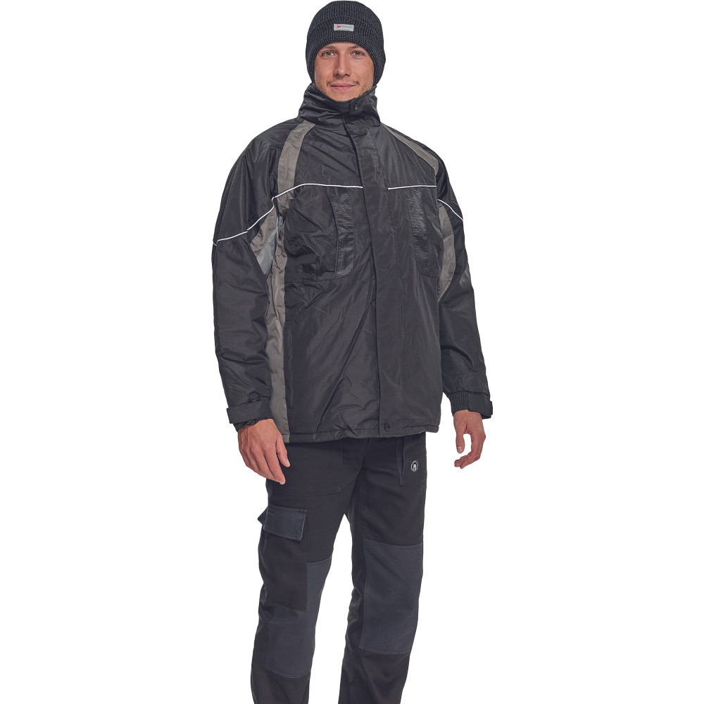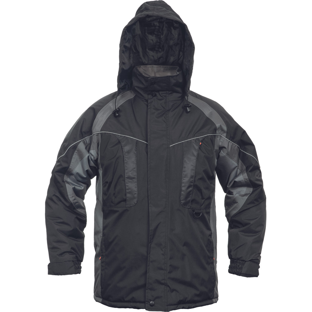 Strapabíró anyagból, kopásállóságot növelő kezeléssel készült, szél és vízálló, kéttónusú téli kabát, gallérba rejthető kapucnival, mikropolár belső gallérral és fényvisszaverő csíkokkal