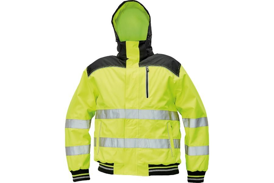Jól láthatósági pilótadzseki fényvisszaverő csíkokkal és lecsatolható kapucnival.