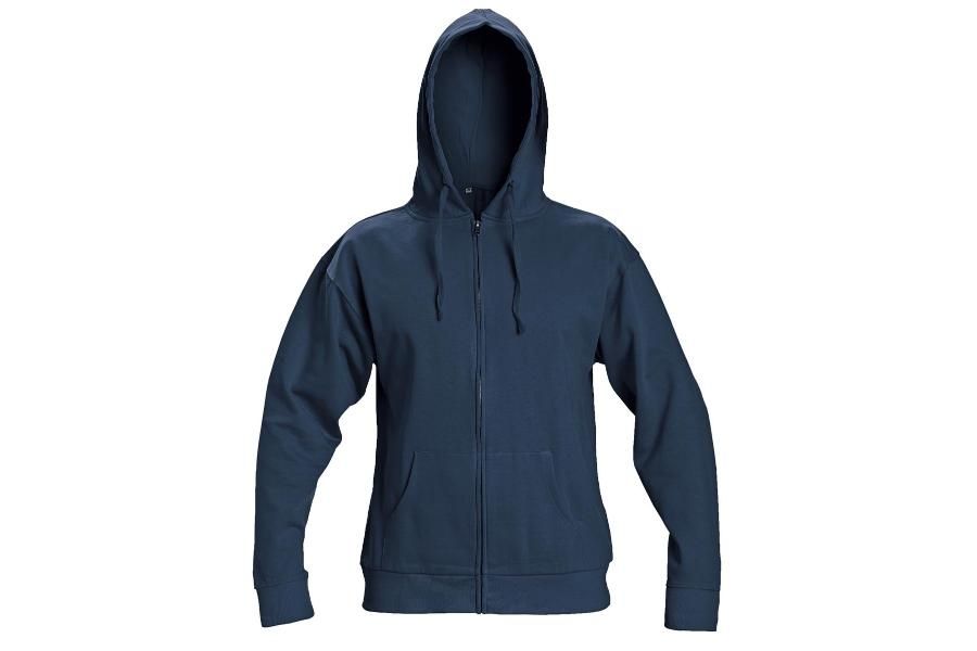 A kék kapucnis pulóver anyaga 80% pamutból és 20% poliészterből készült, 290 g/m2 súlyú.