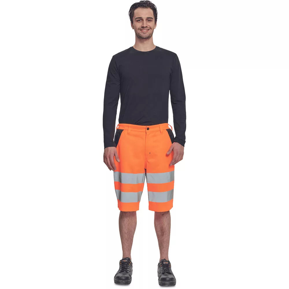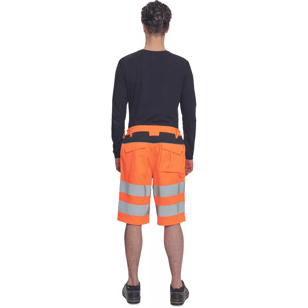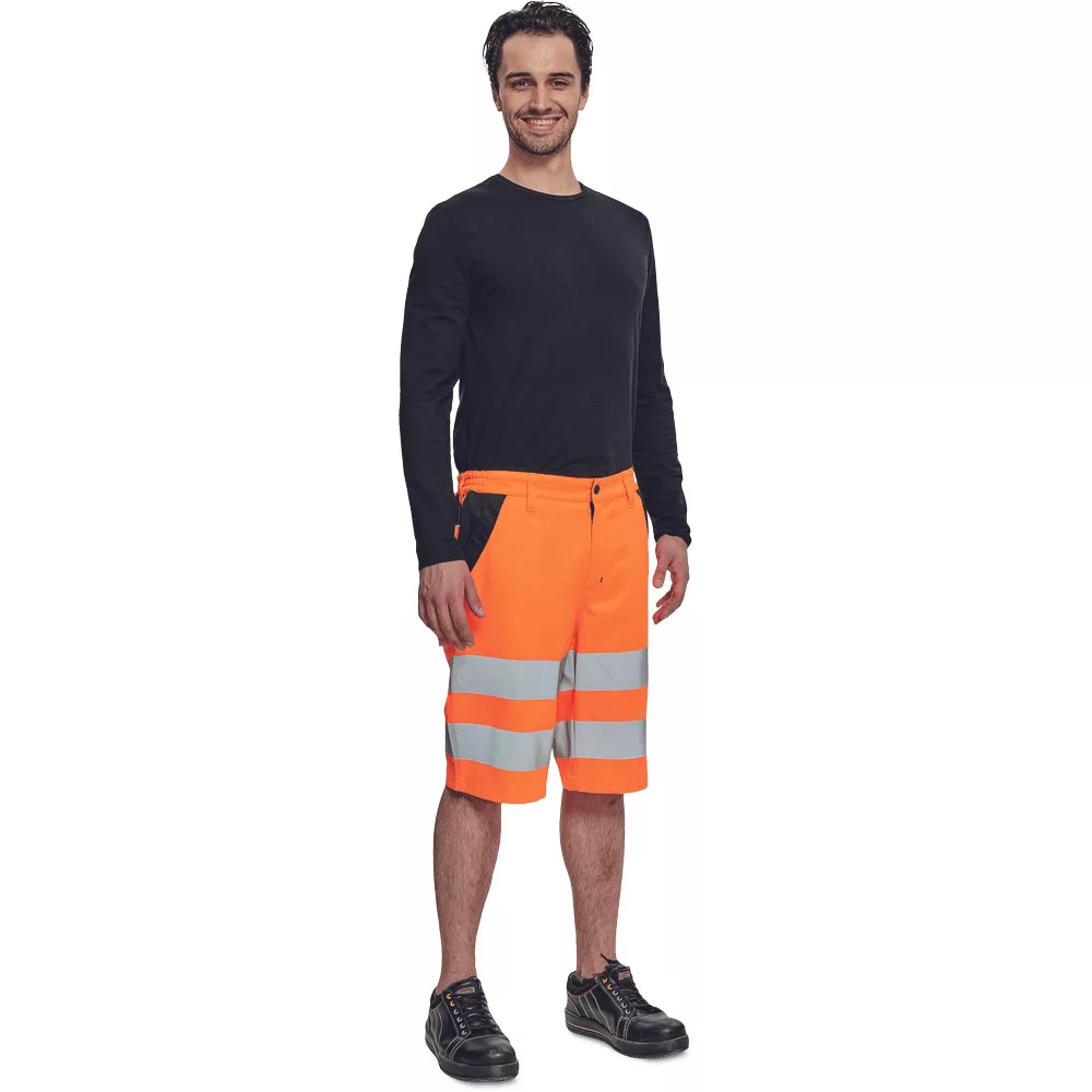 A narancs jól láthatósági rövidnadrág fekete díszítő betétekkel van elkészítve, a dizájnosabb megjelenés, valamint a jobb láthatóság érdekében.