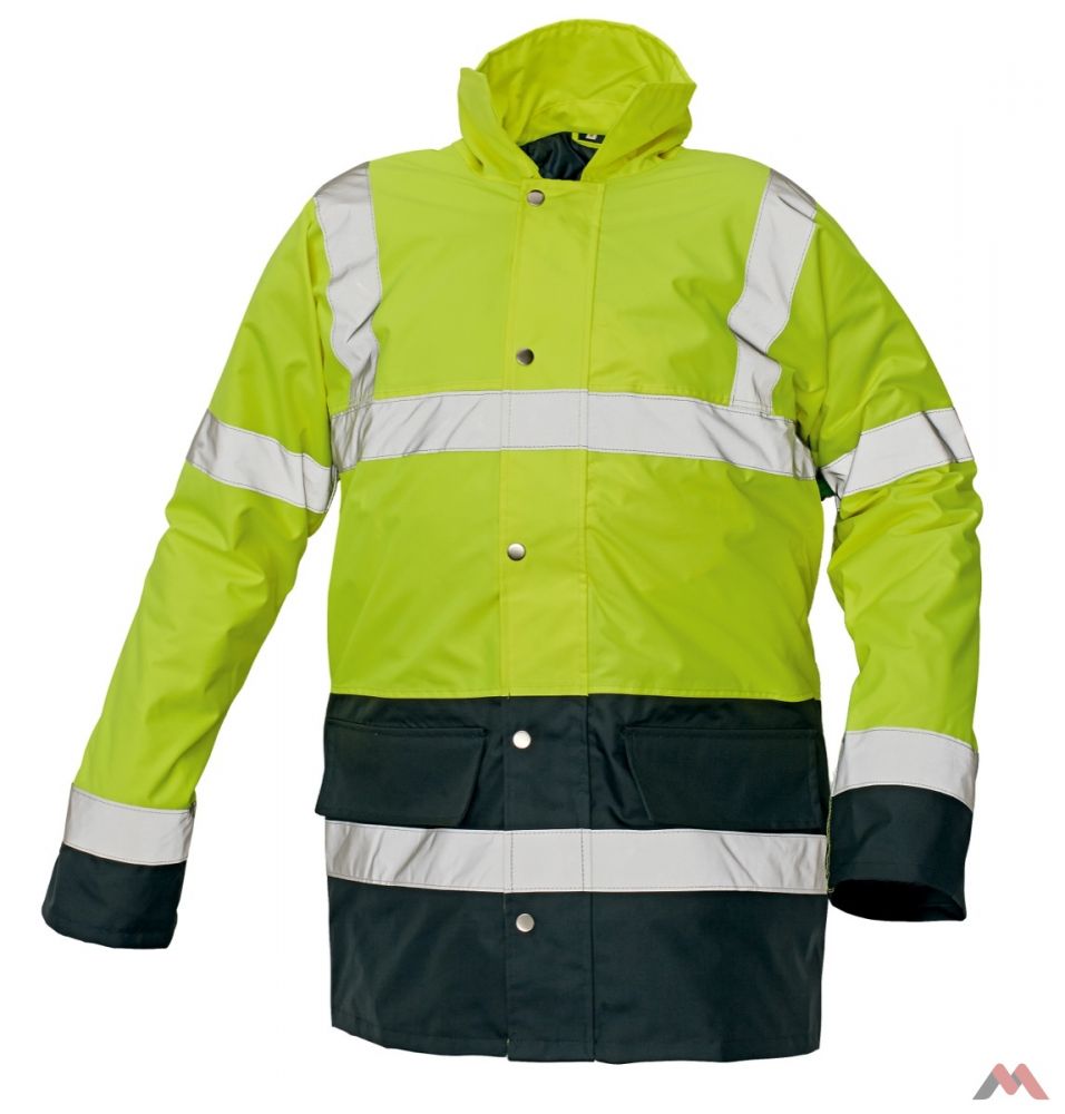 A sárga bélelt kabáton elhelyezett fényvisszaverő csíkok sötétben jól láthatóvá teszi a viselőjét!