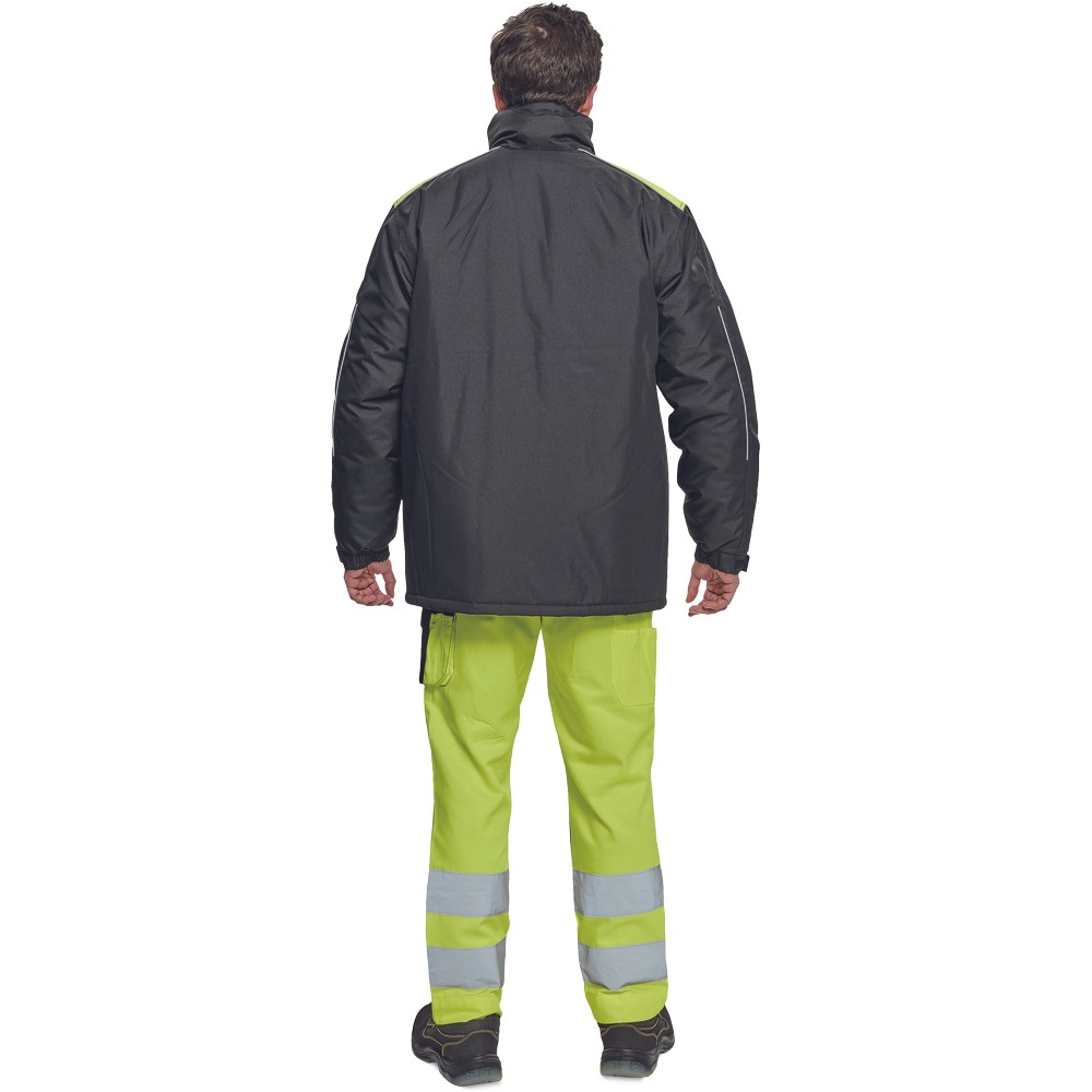 A fekete kabát neon sárga díszítő betétekkel van elkészítve, a dizájnosabb megjelenés érdekében.