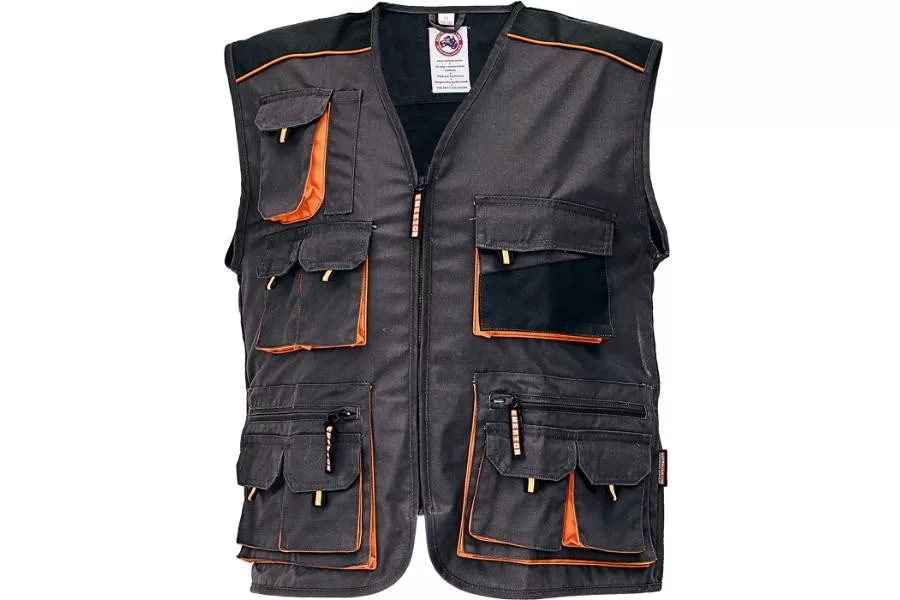 Kevertszálas, kopásálló anyagból készült, kéttónusú, sokzsebes munkás mellény.