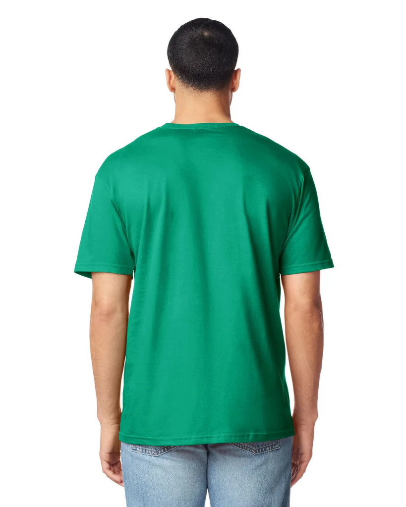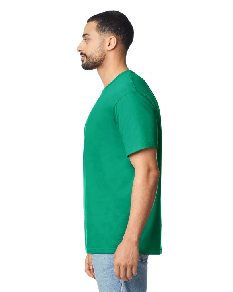 Modern klasszikus szabású Gildan 64000 SoftStyle póló, keskeny bordás nyakkal, kitéphető címkével, dupla tűzésű karkivágással és derékrésszel, Single Jersey pamut szövetből: