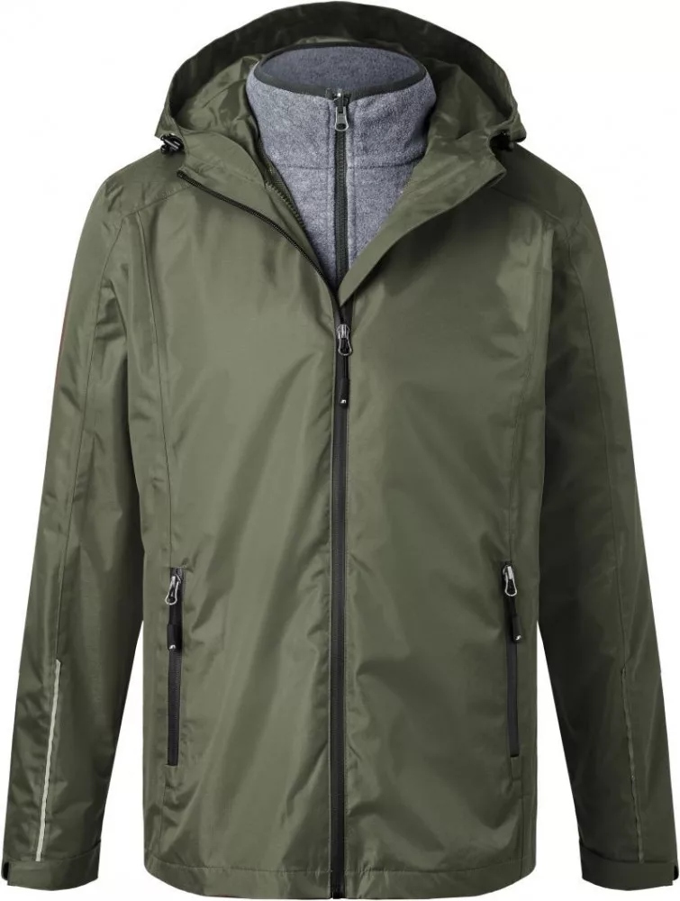 Klasszikus szabású, kiváló minőségű víz- és szélálló, légáteresztő zöld 3 az 1-ben dzseki állítható kapucnival és 2 cipzáras oldalzsebbel.