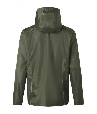 A zöld dzseki 2 cipzáras oldalzsebbel és 1 belső zsebbel készült. Az ujjakon és a hátrészen elhelyezett fényvisszaverő elemeknek köszönhetően sötétben is jól láthatóvá teszi viselőjét.