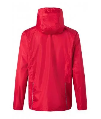 A piros dzseki 2 cipzáras oldalzsebbel és 1 belső zsebbel készült. Az ujjakon és a hátrészen elhelyezett fényvisszaverő elemeknek köszönhetően sötétben is jól láthatóvá teszi viselőjét.