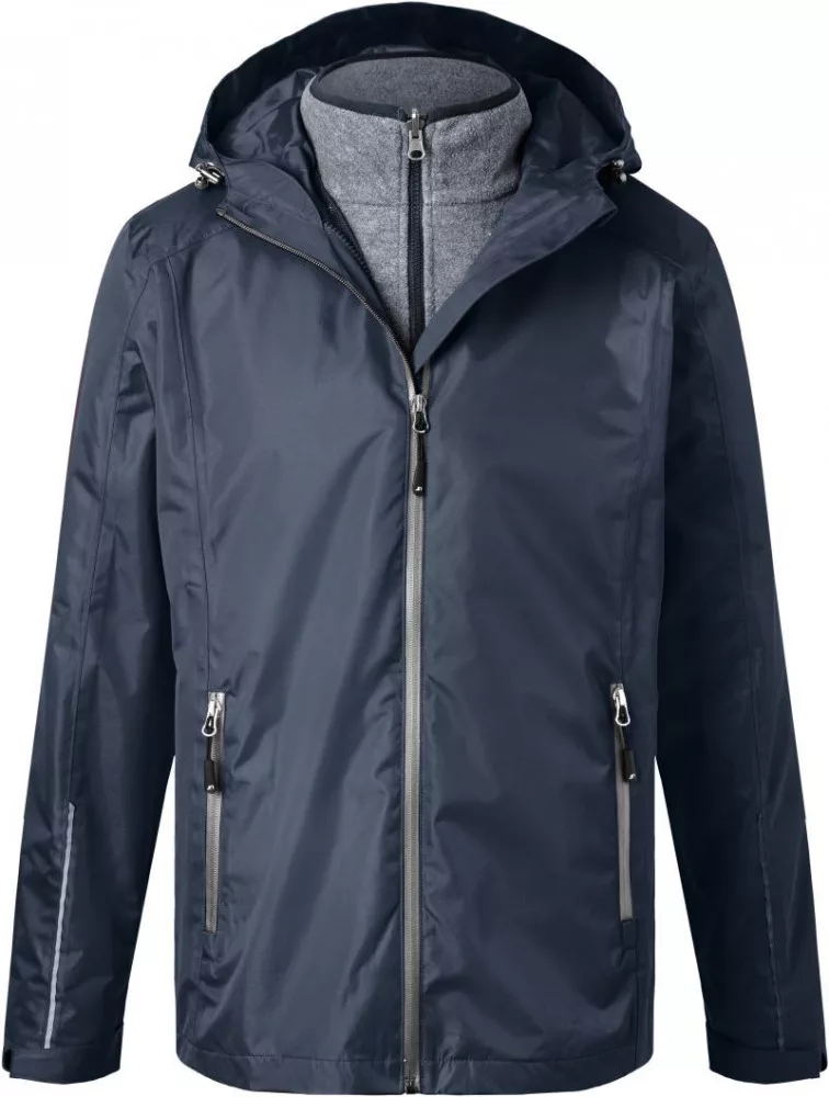Klasszikus szabású, kiváló minőségű víz- és szélálló, légáteresztő kék 3 az 1-ben dzseki állítható kapucnival és 2 cipzáras oldalzsebbel.