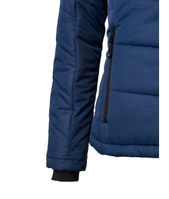 Enyhén karcsúsított szabású, kiváló minőségű szélálló és víztaszító kék bélelt női kabát kontrasztos színösszeállításban.