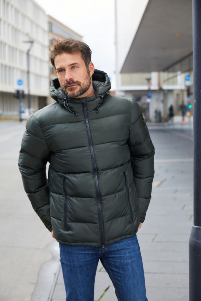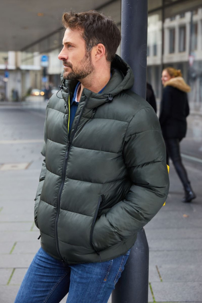 Modern szabású, James&Nicholson JN1168 téli dzseki, állítható kapucnival, a teljes hosszúságú rejtett szélvédő állvédővel, YKK 2 irányú cipzárral, 1 belső- valamint 2 cipzáras oldalzseb, elasztikus belső mandzsettával és kontrasztos színű béléssel, újrahasznosított poliészter Ripp-Stop szövetből, újrahasznosított poliészter béléssel, DuPont™ Sorona® Aura párnázattal (megújuló, bio alapanyag), valamint víz- és szennyeződéstaszító a BIONIC-FINISH®ECO bevonattal!