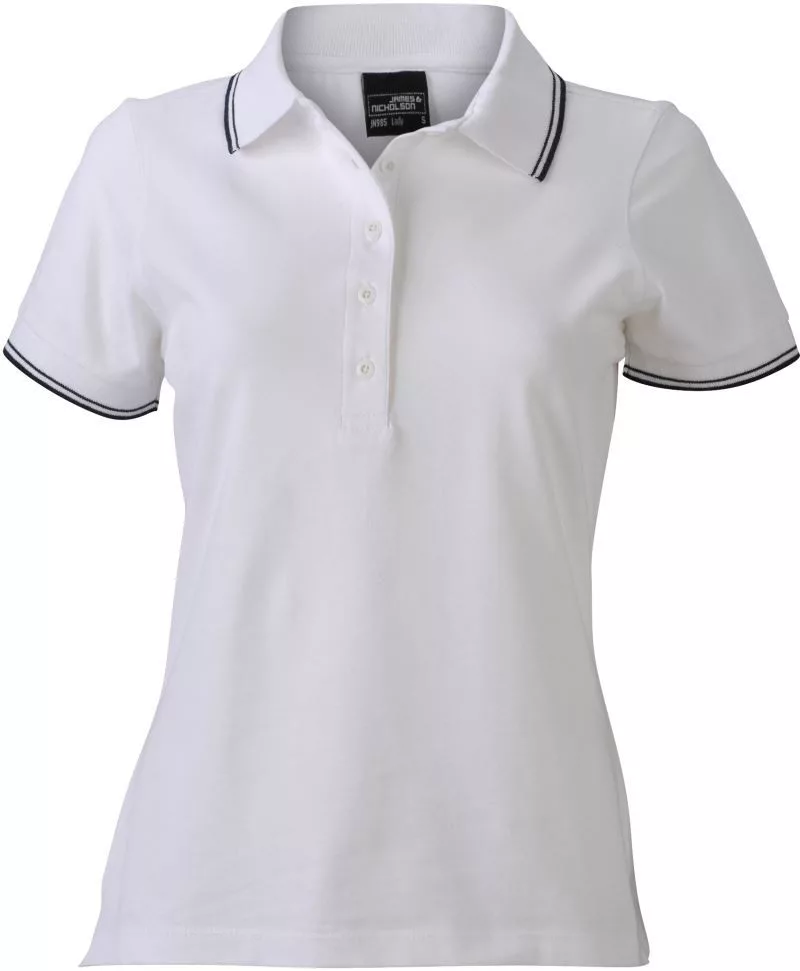 Karcsúsított szabású, kiváló minőségű fehér galléros női póló kontrasztos színösszeállításban.