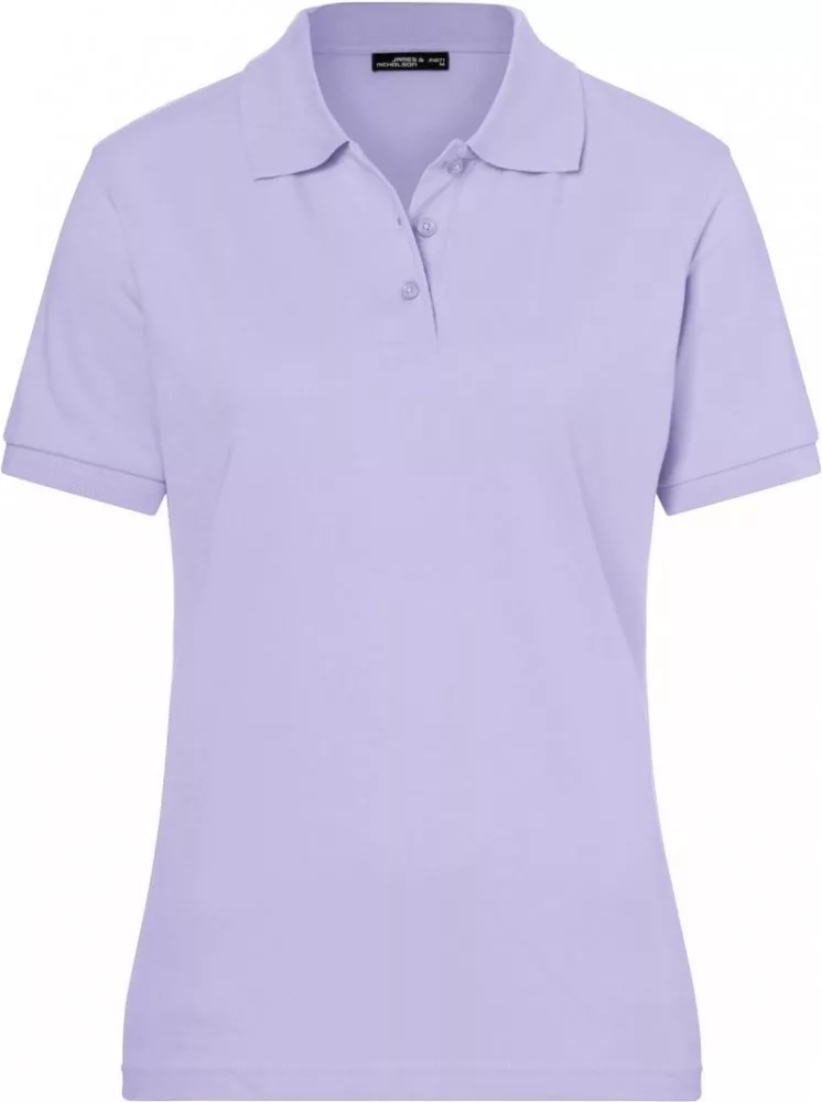 A lila galléros női póló anyaga 100% pamutból (piké) készült, 195 g/m2 súlyú.