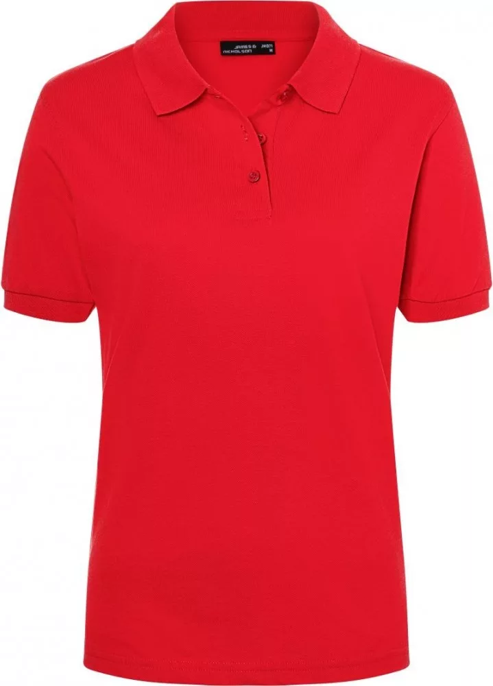 A piros galléros női póló anyaga 100% pamutból (piké) készült, 195 g/m2 súlyú.