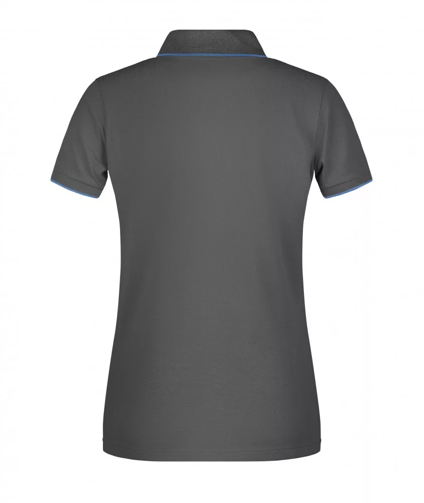 Bordázott ujjvégekkel és gallérral készült. A szürke női póló színben megegyező, 4 gombbal záródik. A váll és nyakrész anyaga duplán tűzött a megfelelő tartás érdekében.