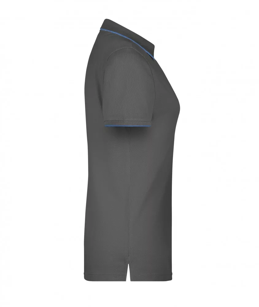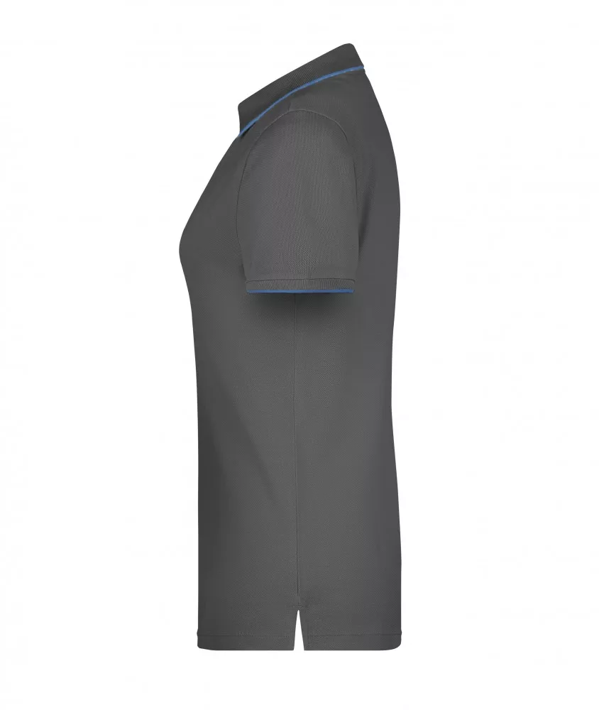Karcsúsított szabású, kiváló minőségű szürke galléros női póló kontrasztos színösszeállításban.