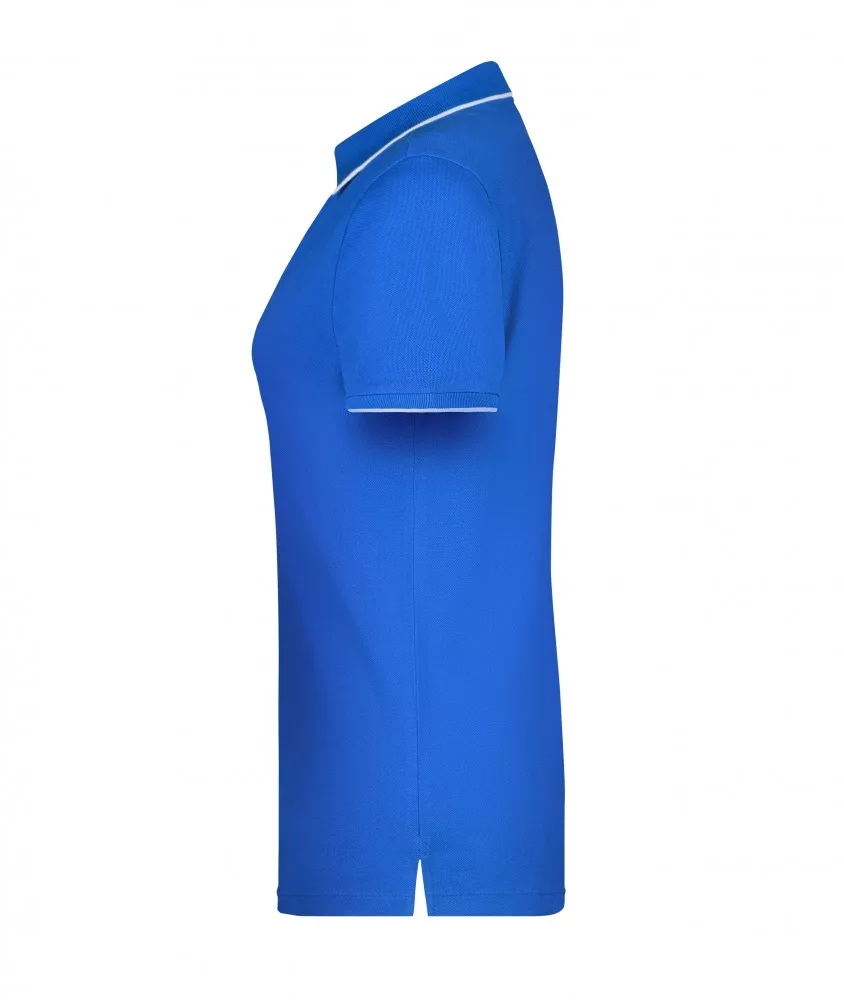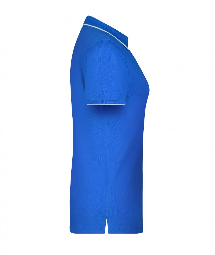 Bordázott ujjvégekkel és gallérral készült. A kék női póló színben megegyező, 4 gombbal záródik. A váll és nyakrész anyaga duplán tűzött a megfelelő tartás érdekében.