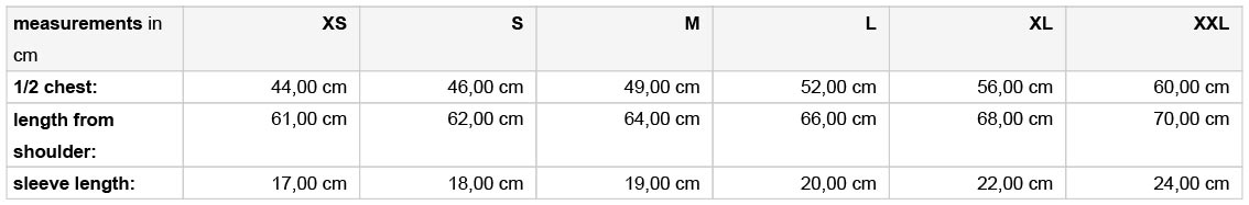 A termék az alábbi méretekben kapható: XS, S, M, L, XL, XXL