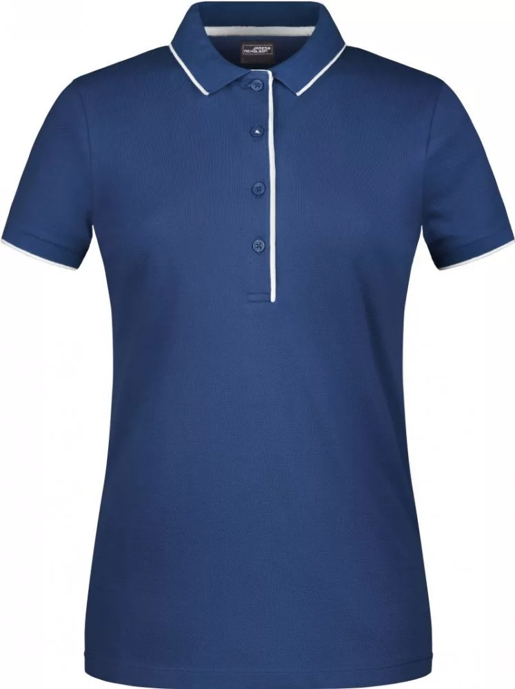 Bordázott ujjvégekkel és gallérral készült. A kék női póló színben megegyező, 4 gombbal záródik. A váll és nyakrész anyaga duplán tűzött a megfelelő tartás érdekében.