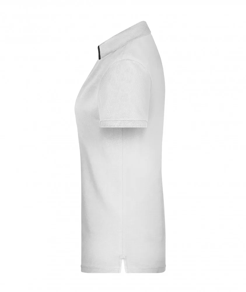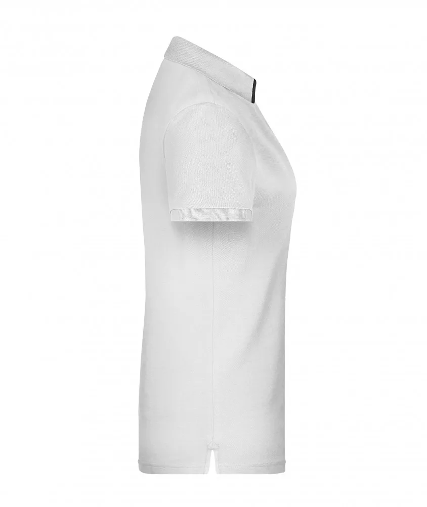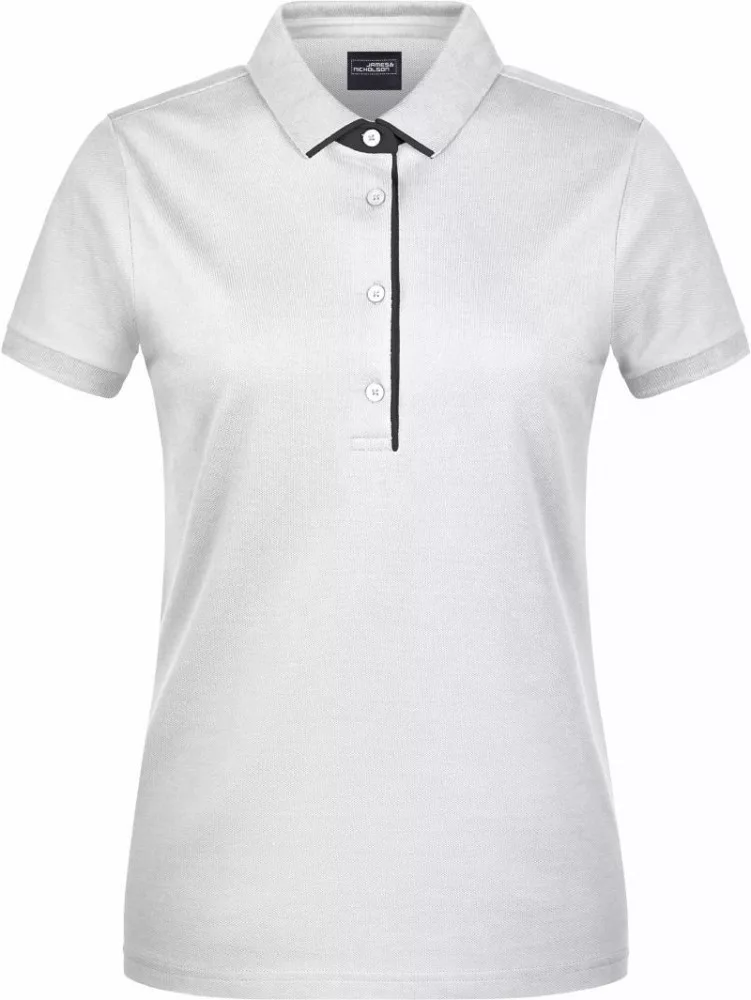 Karcsúsított szabású, kiváló minőségű fehér galléros női póló kontrasztos színösszeállításban.