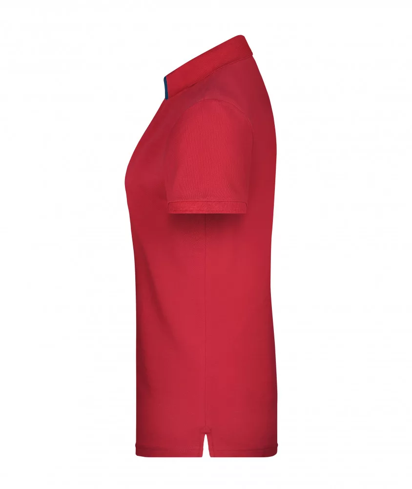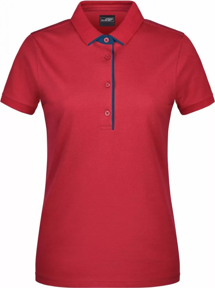 Karcsúsított szabású, kiváló minőségű piros galléros női póló kontrasztos színösszeállításban.
