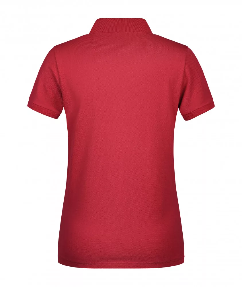 A piros galléros női póló anyaga 100% pamutból (fésült, gyűrűsfonású) készült, 240 g/m2 súlyú.