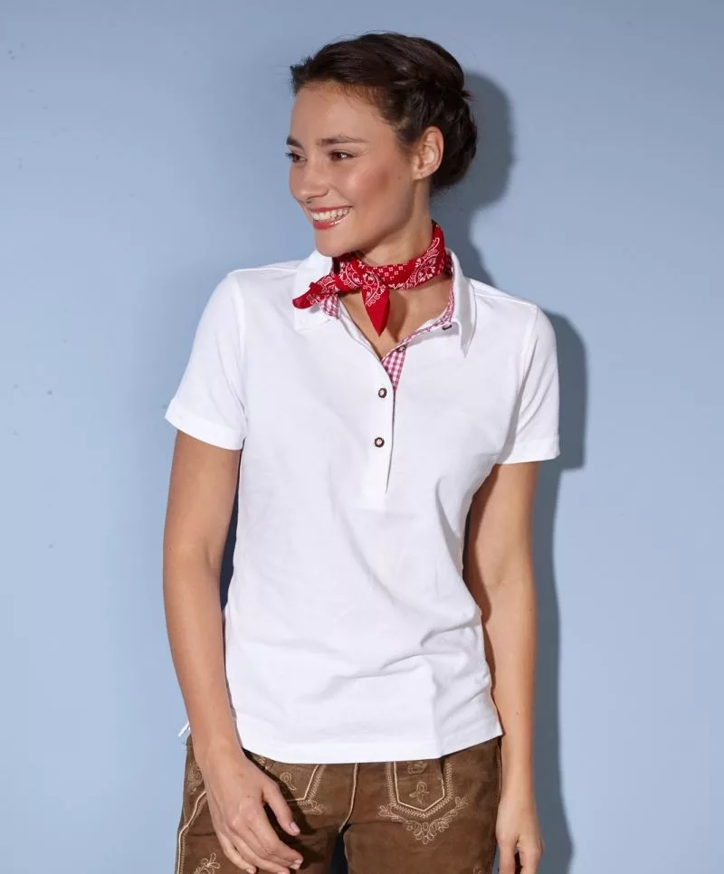 Karcsúsított szabású, kiváló minőségű fehér galléros női póló 4 gombos nyakkivágással, kontrasztos színösszeállításban.