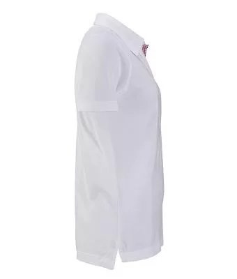 A fehér galléros női póló anyaga 100% pamutból készült, 195 g/m2 súlyú.