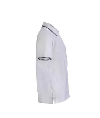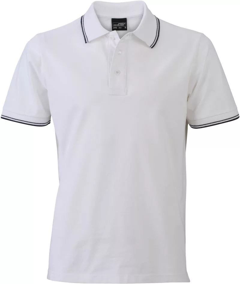 Klasszikus szabású, kiváló minőségű fehér galléros póló kontrasztos színösszeállításban.
