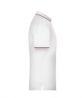 Klasszikus szabású, kiváló minőségű fehér galléros póló kontrasztos színösszeállításban.