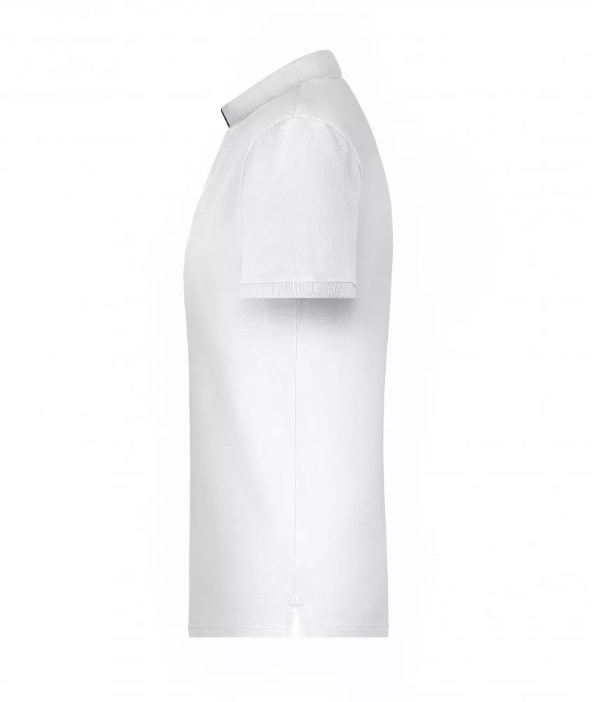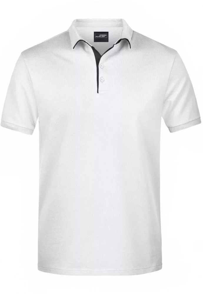 Klasszikus szabású, kiváló minőségű fehér galléros póló kontrasztos színösszeállításban