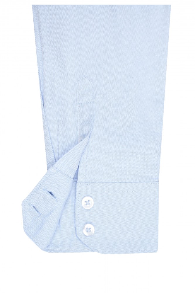 Enyhén karcsúsított szabású, kiváló minőségű kék hosszú ujjú ing kerekített aljjal.