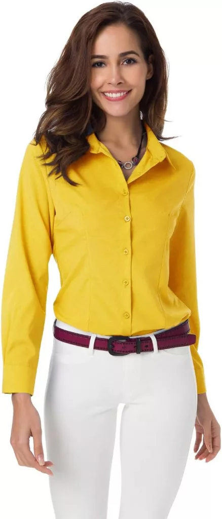 A sárga női ing anyaga 50% pamutból és 50% poliészterből készült, 105 g/m2 súlyú. Könnyen kezelhető anyag.