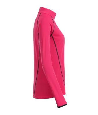 A pink női sport póló álló gallérjának és ujjának belseje kontrasztos színű. Cipzáros állógallérral és áll védelemmel, valamint raglán ujjakkal készült. A női sport póló lélegző, nedvességszabályozó és gyorsan száradó.