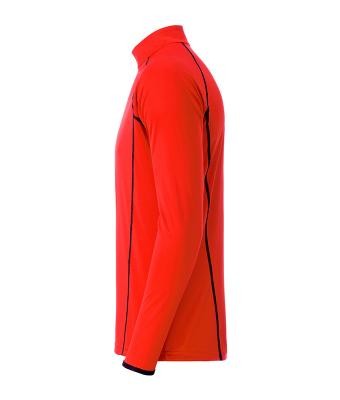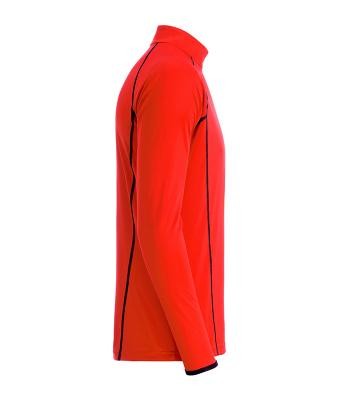 A narancssárga sport póló álló gallérjának és ujjának belseje kontrasztos színű. Cipzáros állógallérral és áll védelemmel, valamint raglán ujjakkal készült. A sport póló lélegző, nedvességszabályozó és gyorsan száradó.