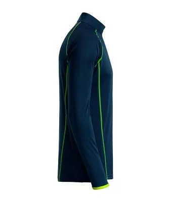 A kék sport póló álló gallérjának és ujjának belseje kontrasztos színű. Cipzáros állógallérral és áll védelemmel, valamint raglán ujjakkal készült. A sport póló lélegző, nedvességszabályozó és gyorsan száradó.