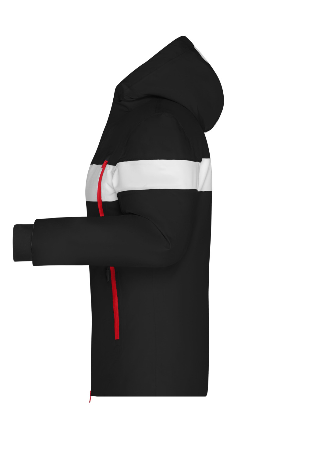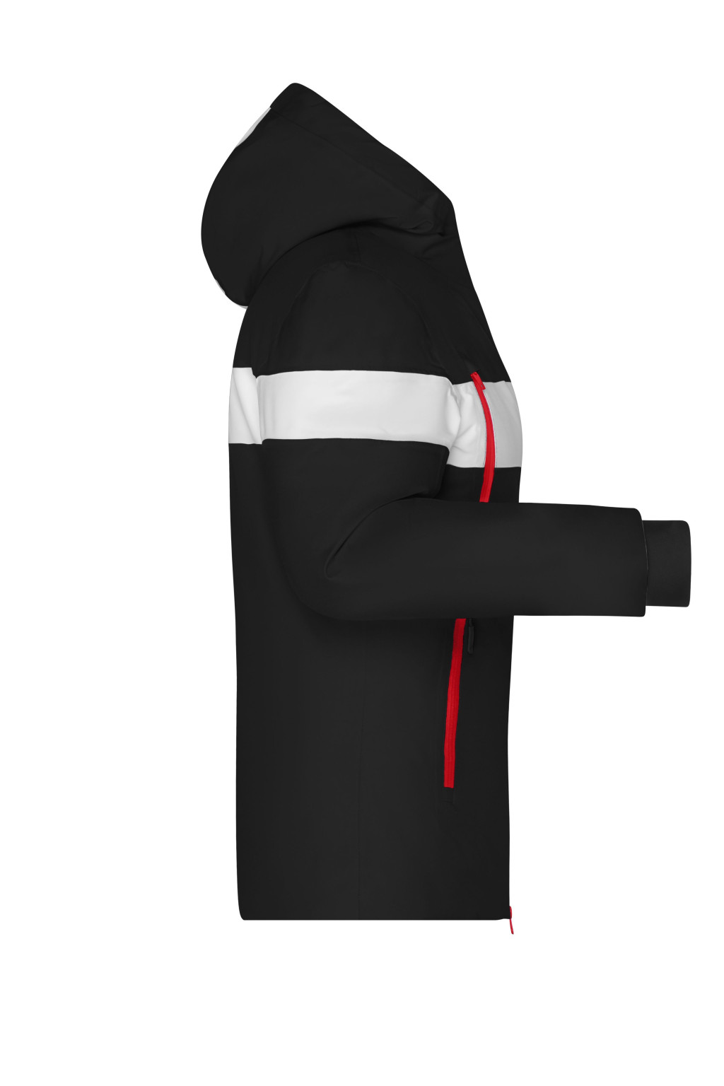 Enyhén karcsúsított, modern szabású, James&Nicholson JN1049 Hybrid téli dzseki, állítható kapucnival, a teljes hosszúságú rejtett szélvédő állvédővel, YKK 2 iránú cipzárral, belső zsebbel, a bal alkaron cipzáras kis zsebbel, 4 elülső zseb vízálló cipzárral és konrtasztos színű betétekkel, szél-, víztaszító és légáteresztő poliészter anyagból, poliészter béléssel, és  DuPont™ Sorona® Aura párnázattal (megújuló, bio alapanyag)!