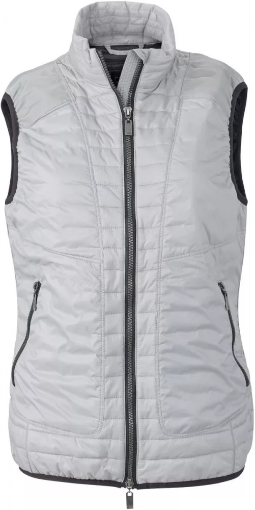 Enyhén karcsúsított szabású, kiváló minőségű szélálló és vízlepergető ezüst női mellény 2 cipzáras oldalzsebbel.