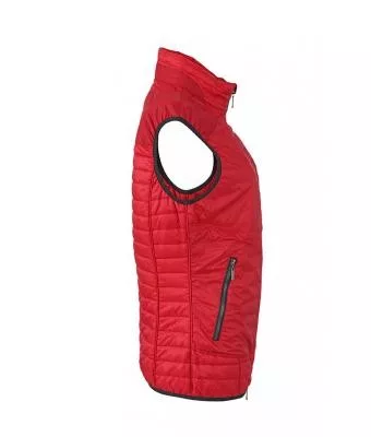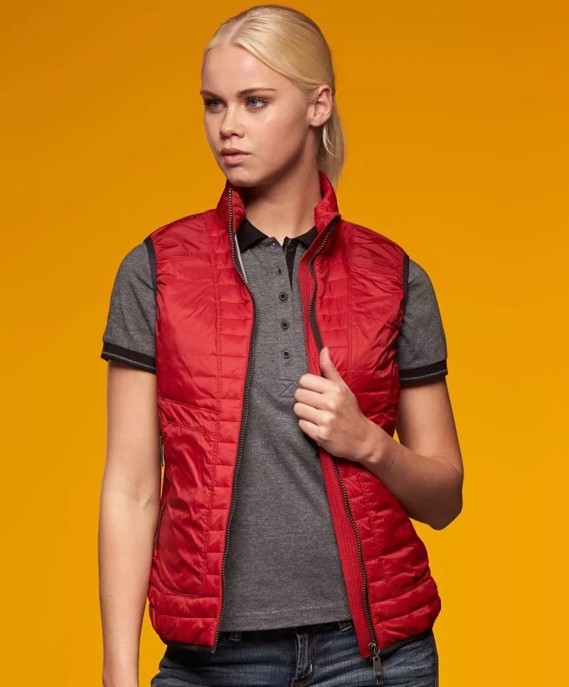 Enyhén karcsúsított szabású, kiváló minőségű szélálló és vízlepergető piros női mellény 2 cipzáras oldalzsebbel.